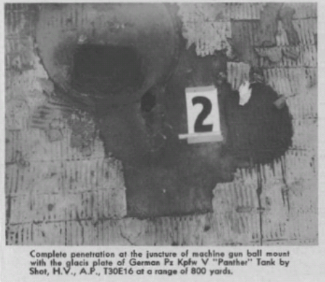 Purpose: This is a special hyper-velocity, armor piercing round for attack of heavily armored vehicles. It gives greatly increased penetrative performance up to 2,000 yards range over the standard A.P.C.-T. Projectile, 90mm, M82. It is especially effective at shorter ranges. … This shot will penetrate all plates of the German Pz Kpfw V “Panther” and “King Tiger” Tanks. IT WILL DEFEAT THE GLACIS PLATE OF THE “PANTHER” AT RANGES UP TO 450 YARDS AND OF THE “KING TIGER” AT 100 YARDS RANGE. UP TO RANGES OF 800 YARDS THE SHOT WILL PENETRATE THE GUN MANTLET AND TURRET FRONT OF BOTH THE “PANTHER” AND “KING TIGER” TANKS.